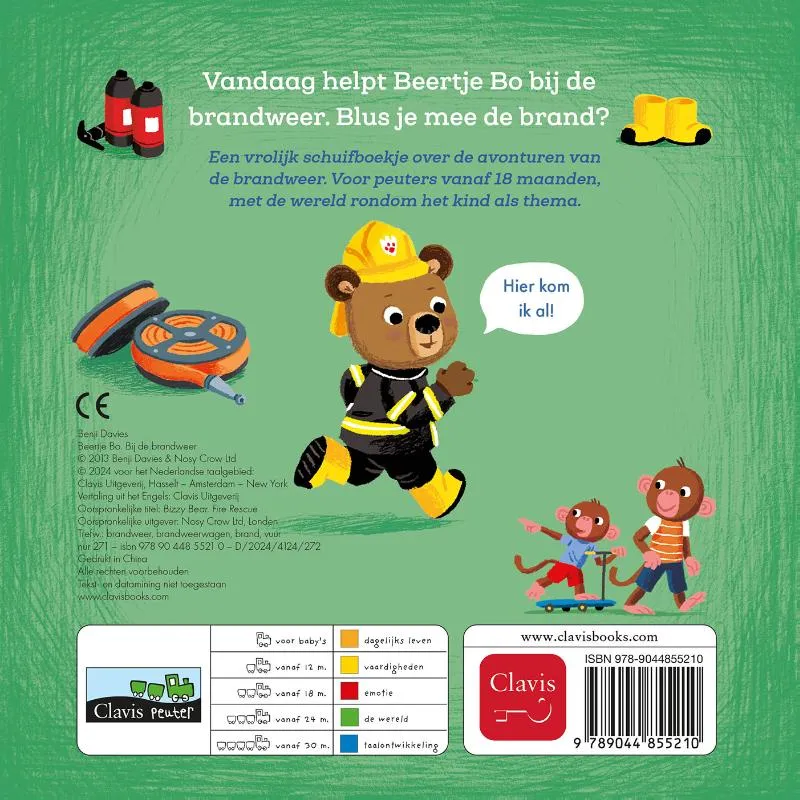 Vandaag helpt Beertje Bo bij de brandweer. Blus je mee de brand? Een vrolijk schuifboekje over de avonturen van de brandweer. Voor peuters vanaf 18 maanden, met de wereld rondom het kind als thema.
