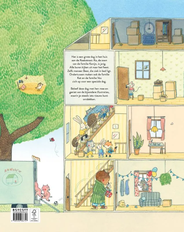 Op de Koekstraat 3 is het een speciale dag: Klein Konijn is jarig! Zijn moeder bereidt zijn favoriete ontbijt, zijn zusje heeft een mooie tekening gemaakt, en het allerleukste is dat hij een verjaardagsfeestje geeft! Vriendjes zijn uitgenodigd, zijn vader hangt versieringen op, en zijn moeder bakt een heerlijke taart. Maar er gebeurt nog veel meer vandaag. Boven hen verhuist de familie Kat, de familie Vos verwacht een nieuwe baby en meneer Uil probeert wat slaap te krijgen. Er is zoveel bedrijvigheid in en rond dit bruisende gebouw!