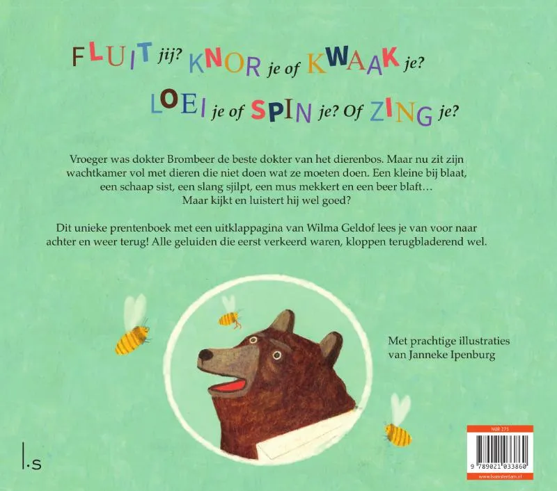 Met Bijen blaten niet, dokter Brombeer van auteur Wilma Geldof en illustrator Janneke Ipenburg is voorleessucces gegarandeerd. Want dit prentenboek lees je niet alleen van voor naar achter – maar ook weer terug! Ontdek meteen welke dieren welke geluiden maken.