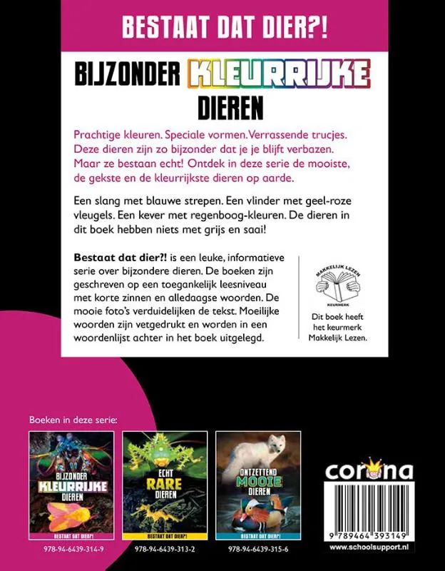 Bestaat dat dier?! is een leuke, informatieve serie over bijzondere dieren. De boeken zijn geschreven op een toegankelijk leesniveau met korte zinnen en alledaagse woorden. De mooie foto’s verduidelijken de tekst. Moeilijke woorden zijn vetgedrukt en worden in een woordenlijst achter in het boek uitgelegd.