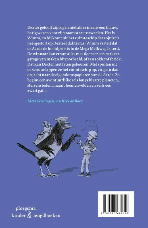 Dexter gelooft zijn ogen niet als er ineens een blauw, harig wezen voor zijn raam staat te zwaaien. Het is Wimm, en hij komt uit het ruimteschip dat zojuist is neergestort op Dexters dakterras. Wimm vertelt dat de Aarde de hoofdprijs is in de Mega Melkweg Loterij. De winnaar kan er van alles mee doen: er een parkeergarage van maken bijvoorbeeld, of een sokkenfabriek. Dat kan Dexter niet laten gebeuren! Met spullen uit de schuur lappen ze het ruimteschip op, en gaan dan op jacht naar de eigendomspapieren van de Aarde. Zo begint een avontuurlijke reis langs bizarre planeten, sterrensteden, maanbloemenvelden en zelfs een zwart gat…