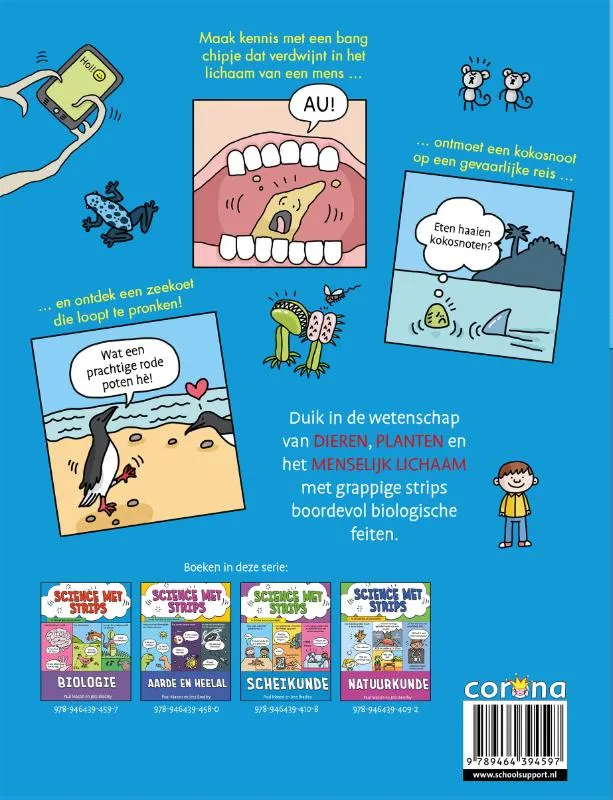 Duik in de wetenschap van dieren, planten en het menselijk lichaam met grappige strips boordevol biologische feiten.