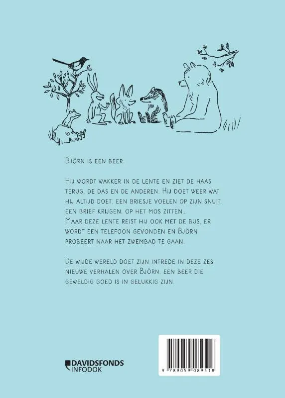 Björn is een beer, een beer die geweldig goed is in gelukkig zijn. Hij wordt wakker in de lente en ziet de haas terug, de das en de anderen. Hij doet weer wat hij altijd doet: een briesje voelen op zijn snuit, een brief krijgen, op het mos zitten… Maar deze lente reist hij ook met de bus, er wordt een telefoon gevonden en Björn probeert naar het zwembad te gaan. De wijde wereld doet zijn intrede in deze zes nieuwe verhalen over Björn.