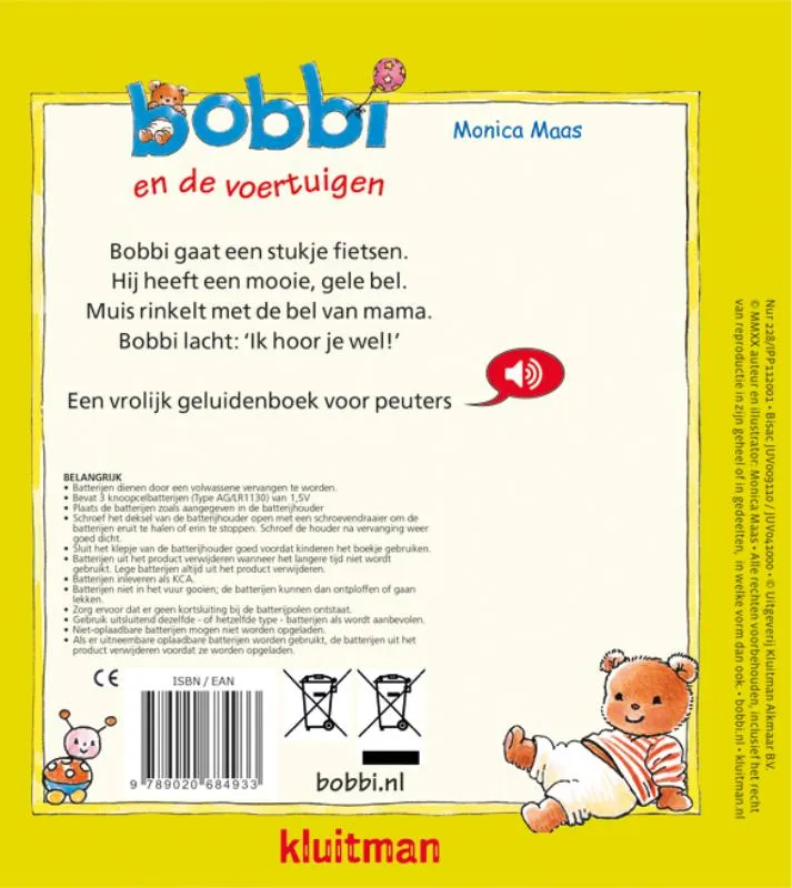 In Bobbi en de voertuigen neemt Bobbi zijn lezers mee op reis. Kinderen ontdekken welke voertuigen er op de weg te zien zijn én wat voor geluiden ze maken. Pep pep, toet toet, vroem vroem!