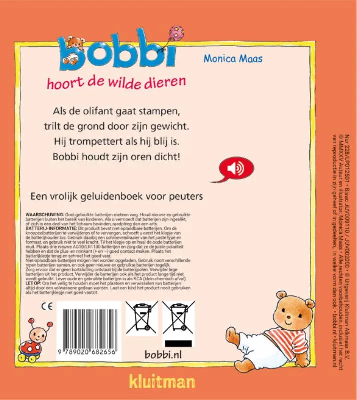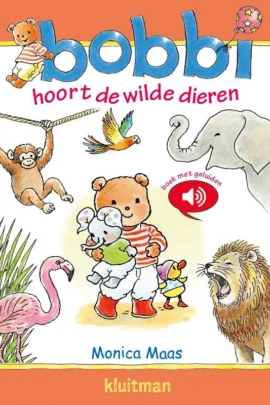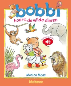 De Bobbi-geluidenboeken zijn heel populair bij de Bobbi-fans. Bobbi hoort de wilde dieren is alweer de vijfde titel in de serie. Bobbi gaat op avontuur en luistert naar de geluiden van wilde dieren. Hoor je de leeuw brullen? De olifant trompettert erop los. De papegaai en de flamingo maken een hoop kabaal en wat maakt de aap eigenlijk voor geluid? Met de leuke versjes, kleurrijke illustraties en natuurlijk beertje Bobbi is dit boek weer een feest voor peuters (en baby’s, kleuters, ouders…).