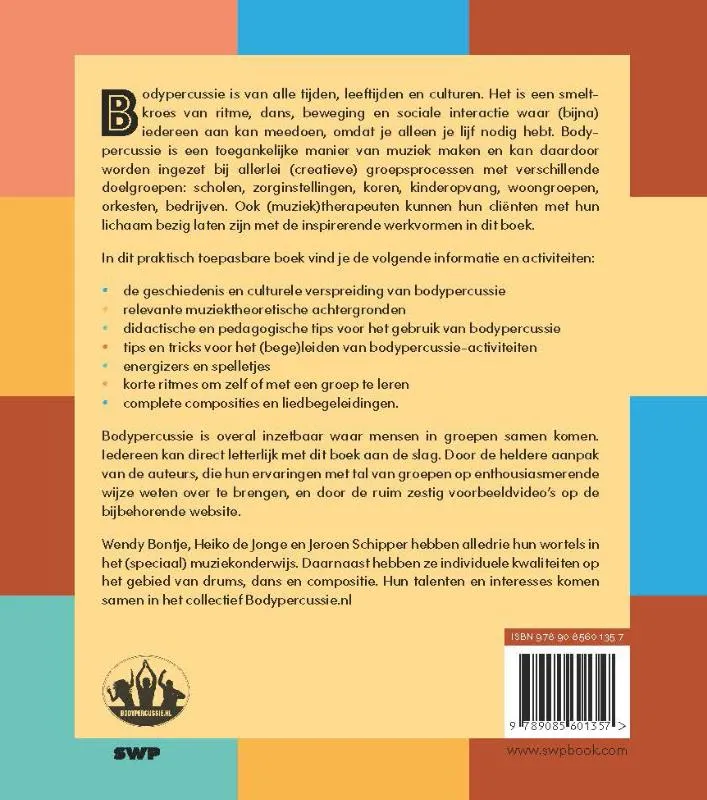 Bodypercussie is van alle tijden, leeftijden en culturen. Het is een smeltkroes van ritme, dans, beweging en sociale interactie waar (bijna) iedereen aan kan meedoen, omdat je alleen je lijf nodig hebt. Bodypercussie is een toegankelijke manier van muziek maken en kan daardoor worden ingezet bij allerlei (creatieve) groepsprocessen met verschillende doelgroepen: scholen, zorginstellingen, koren, kinderopvang, woongroepen, orkesten, bedrijven. Ook (muziek)therapeuten kunnen hun cliënten met hun lichaam bezig laten zijn met de inspirerende werkvormen in dit boek.