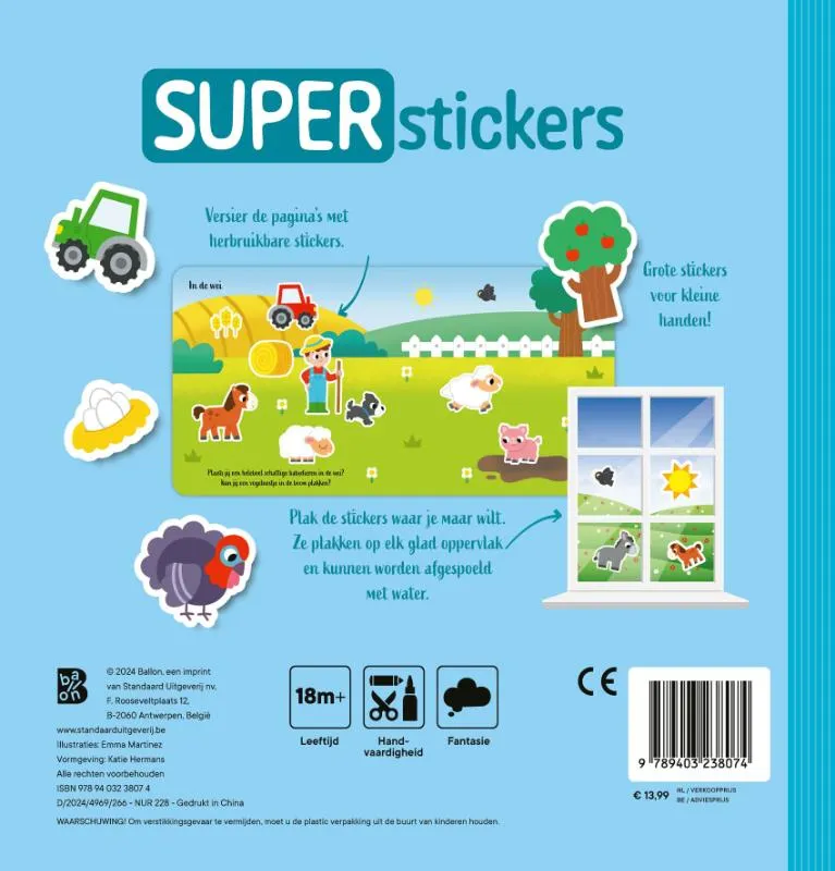 Deze superstickers zullen een favoriet van de kleintjes worden. Ze kunnen de paginagrote scènes in het boek opnieuw en opnieuw versieren. De stickers zijn makkelijk te hanteren en eindeloos herbruikbaar. Bovendien kun je ze op alle gladde oppervlakken plakken. Zo versier je het raam, de koelkast, je drinkfles…