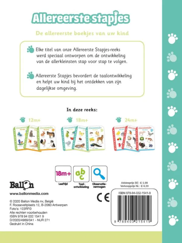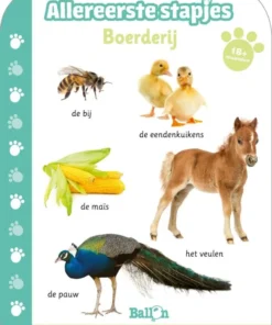 Hardkartonnen aanwijsprentenboekje met kleurenfoto’s van enkele boerderijdieren, aangevuld met enkele vragen. Vanaf ca. 2,5 jaar.