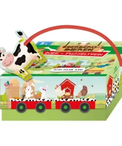 De boerderijdieren gaan op reis met de trein. Ga je gezellig mee? Leg de stukjes van de puzzeltrein in de goede volgorde. Lukt het om alle dieren te vinden? Dit leuke doosje bevat tien puzzelstukjes en een tien-pagina tellend boekje met rijmpjes over de boerderijdieren. Zowel doosje, boekje als puzzelstukjes zijn van stevig karton gemaakt en zijn voorzien van de mooiste kleurrijke illustraties! Het boek en de puzzelstukken zitten in een mooie stevige bewaardoos die gemakkelijk te dragen is door het touwtje. Maak de trein nog langer door ook andere treinpuzzels aan te laten sluiten! Er zijn verschillende thema’s beschikbaar.