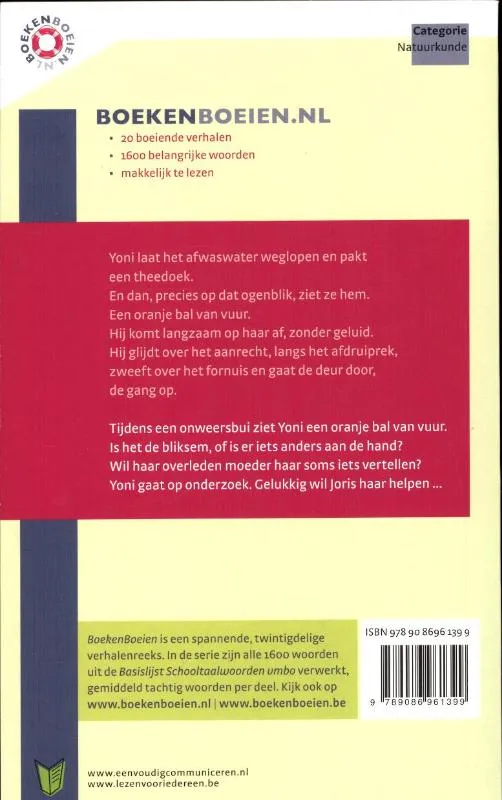 Tijdens een onweersbui ziet Yoni een oranje bal van vuur. Is het de bliksem, of is er iets anders aan de hand? Wil haar overleden moeder haar soms iets vertellen? Yoni gaat op onderzoek. Gelukkig wil Joris haar helpen.