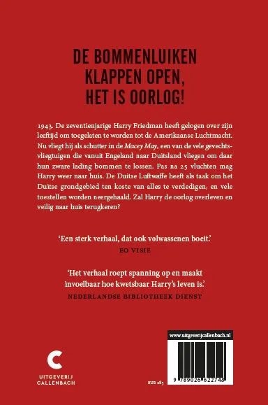 ‘Bomber’ van Paul Dowswell is een spannende YA over de Tweede Wereldoorlog. Harry Friedman heeft gelogen over zijn leeftijd om toegelaten te worden in de Amerikaanse Luchtmacht. Nu vliegt hij als schutter in de Maisy May, een van de vele Boeings B-17 Flying Fortress die vanuit Norfolk, Engeland, naar Duitsland vliegen om daar met precisie hun zware lading bommen te lossen. Pas na 25 vluchten mag Harry weer naar huis. De Duitse Luftwaffe heeft als taak om het Duitse grondgebied ten koste van alles te verdedigen. De formatie B-17’s krijgt het zwaar te verduren en vele toestellen worden neergehaald. Harry is bang dat hij niet meer thuiskomt om zijn 17e verjaardag mee te maken. Een verhaal over moed en vriendschap als het er echt op aan komt! Van de auteur van o.a. ‘Ausländer’ en ‘Wolfskinderen’.