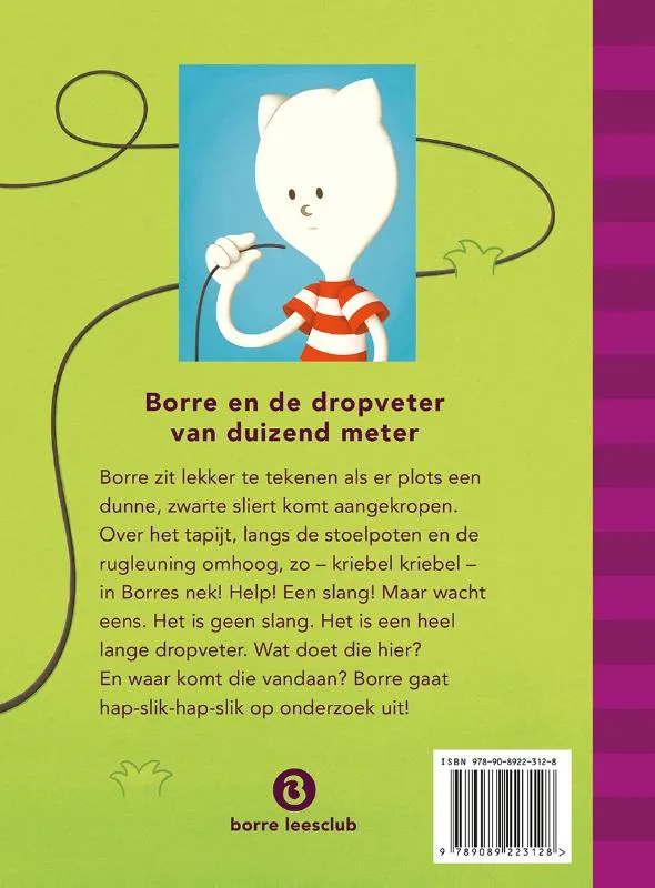 Vanaf 3 jaar. Borre zit lekker te tekenen als er plots een dunne, zwarte sliert komt aangekropen. Over het tapijt, langs de stoelpoten en de rugleuning omhoog, zo – kriebel kriebel – in Borres nek. Help! Een slang! Of wacht eens even… het is een heel lange dropveter! Waar komt dat ding nu vandaan?