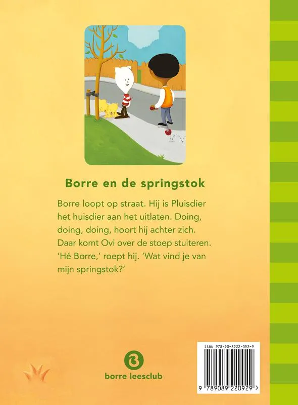 Vanaf 7 jaar. Ovi, een vriendje van Borre, is een echte uitvinder. Hij heeft een springstok uitgevonden, die helemaal uit zichzelf springt. Borre wil ook wel een stukje stuiteren, maar dan gaat de springstok er in zijn eentje doing doing doing vandoor! Maar dat is niet de bedoeling! Borre en Ovi rennen achter het ding aan. Zullen ze hem nog te pakken krijgen? Lees ‘Borre en de springstok’!