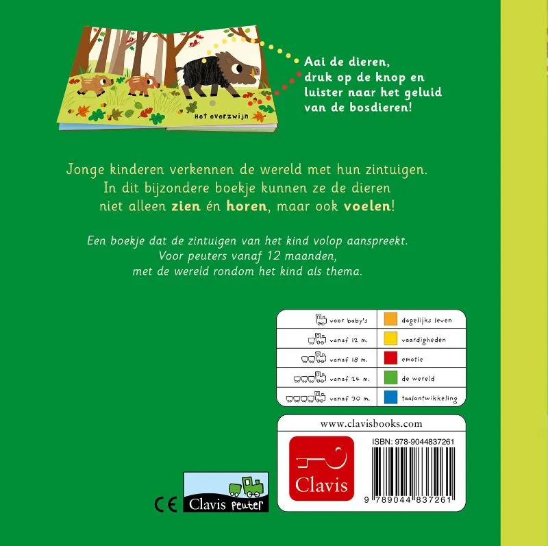 Een boekje dat de zintuigen van het kind volop aanspreekt. Voor peuters vanaf 12 maanden, met de wereld rondom het kind als thema.Jonge kinderen verkennen de wereld met hun zintuigen. In dit bijzondere boekje kunnen ze de dieren niet alleen zien én horen, maar ook voelen!