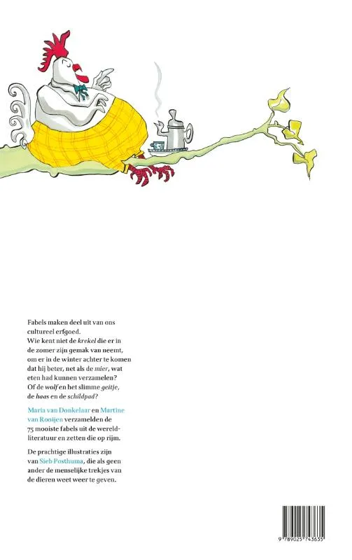 Bekroond met de Gouden Penseel 2009! Fabels maken deel uit van ons cultureel erfgoed. Wie kent niet het verhaal van de haas en de schildpad, of dat van de vos en de ooievaar? Maria van Donkelaar en Martine van Rooijen (bekend van de bundels ‘Het hele jaar rond’, ‘Vuurvliegjes, tovervisjes en schatgravers’ en ‘Niet verder vertellen’) verzamelden de 75 mooiste fabels uit de wereldliteratuur en zetten die op rijm. De prachtige illustraties zijn van de hand van Sieb Posthuma, die op sublieme, humoristische wijze de menselijke trekjes van de dieren weet weer te geven. Het resultaat is een prachtig voorleesboek voor thuis en in de groep.