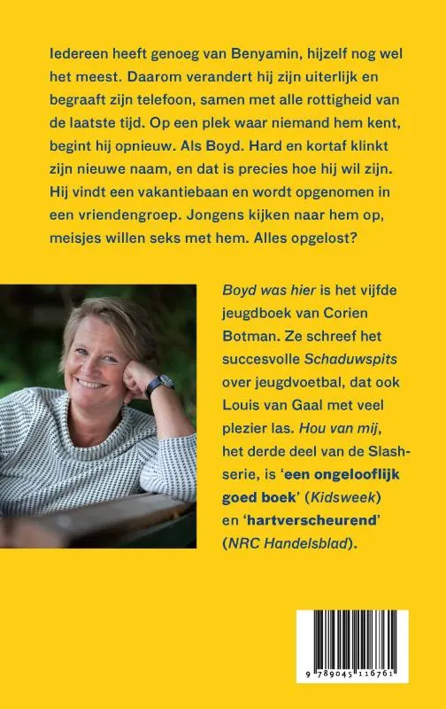 Boyd was hier is het vijfde jeugdboek van Corien Botman. Ze schreef het succesvolle Schaduwspits over jeugdvoetbal, dat ook Louis van Gaal met veel plezier las. Hou van mij, het derde deel van de Slash-serie, is ‘een ongelooflijk goed boek’ (Kidsweek) en ‘hartverscheurend’ (NRC Handelsblad).