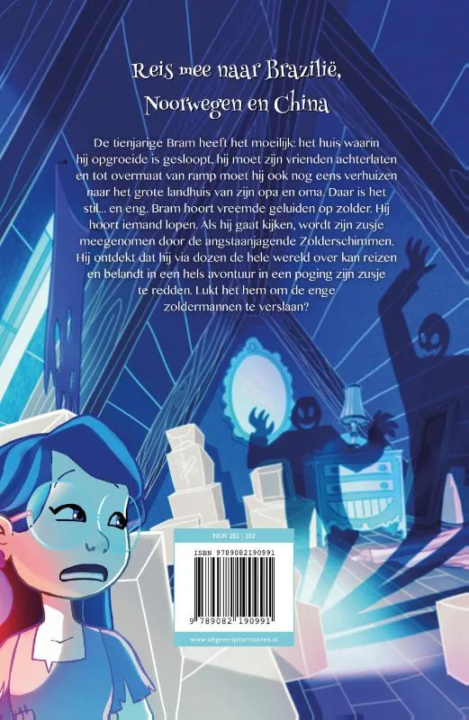 De tienjarige Bram heeft het moeilijk: het huis waarin hij opgroeide is gesloopt, hij moet zijn vrienden achterlaten en tot overmaat van ramp moet hij ook nog eens verhuizen naar het grote landhuis van zijn opa en oma. Daar is het stil… en eng. Bram hoort vreemde geluiden op zolder. Hij hoort iemand lopen. Als hij gaat kijken, wordt zijn zusje meegenomen door de angstaanjagende Zolderschimmen. Hij ontdekt dat hij via dozen de hele wereld over kan reizen en belandt in een hels avontuur in een poging zijn zusje te redden. Lukt het hem om de enge zoldermannen te verslaan?