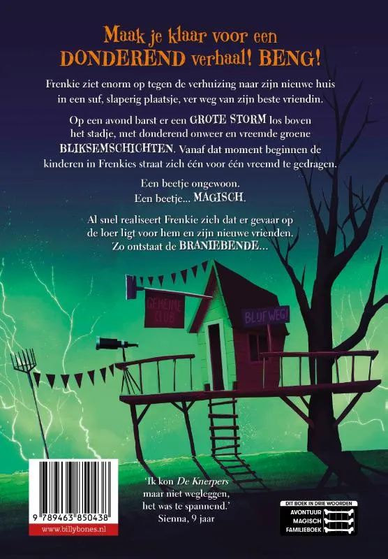 Frenkie ziet enorm op tegen de verhuizing naar zijn nieuwe huis in een suf, slaperig plaatsje, ver weg van zijn beste vriendin. Op een avond barst er een GROTE STORM los boven de stad, met donderend onweer en vreemde groene BLIKSEMSCHICHTEN. Vanaf dat moment beginnen de kinderen in Frenkies straat zich één voor één vreemd te gedragen. Een beetje ongewoon. Een beetje… MAGISCH. Al snel realiseert Frenkie zich dat er gevaar op de loer ligt voor hem en zijn nieuwe vrienden. Zo ontstaat de BRANIEBENDE…