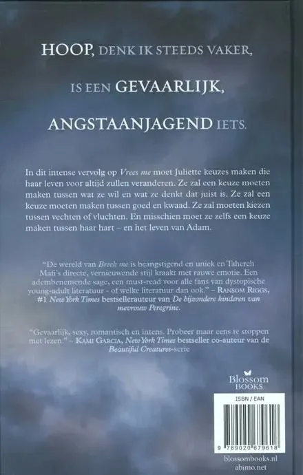 In dit intense vervolg op Vrees me moet Juliette keuzes maken die haar leven voor altijd zullen veranderen. Ze zal een keuze moeten maken tussen wat ze wil en wat ze denkt dat juist is. Ze zal een keuze moeten maken tussen goed en kwaad. Ze zal moeten kiezen tussen vechten of vluchten. En misschien moet ze zelfs een keuze maken tussen haar hart – en het leven van Adam.