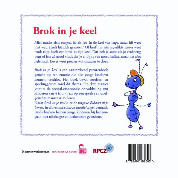 <br>Naast Brok in je keel is er de uitgave Bibbers in je benen. In dit verhaal staat de emotie ‘angst’ centraal. Beide boeken helpen jonge kinderen bij het omgaan met alledaagse en herkenbare gevoelens.
