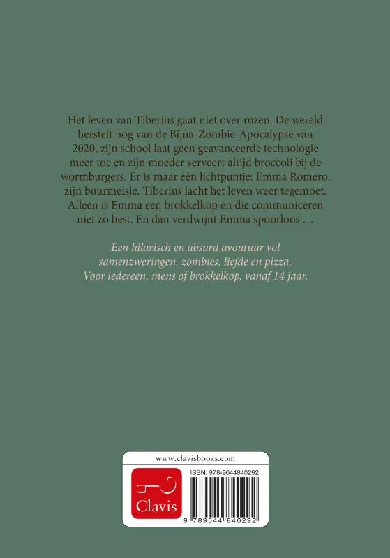 Het leven van Tiberius gaat niet over rozen. De wereld herstelt nog van de Bijna-Zombie-Apocalypse van 2020, zijn school laat geen geavanceerde technologie meer toe en zijn moeder serveert altijd broccoli bij de wormburgers. Er is maar één lichtpuntje: Emma Romero, zijn buurmeisje. Tiberius lacht het leven weer tegemoet. Alleen is Emma een brokkelkop en die communiceren niet zo best. En dan verdwijnt Emma spoorloos …