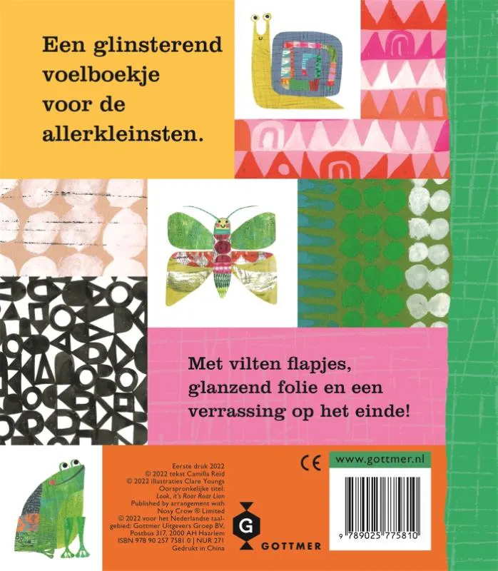 ‘Brul brul, daar is Leeuw’ is een bijzonder peuterboekje vol jungledieren ̶ met flappen van vilt, een spiegeltje en illustraties in glitters en goud. In ‘Brul brul, daar is Leeuw’ stapt steeds een wild dier de bladzijde op. Maar zitten er nog meer beestjes verstopt achter de flappen? Elke pagina van dit ontdekboek van gebonden karton is een feestje, met een prachtig geïllustreerd dier, glinsterend van het goudfolie en een vrolijk gekleurde vilten flap met een verrassing erachter. Het mooie peuterboekje is perfect voor een interactief raadspelletje over dierengeluiden in het wild. Helemaal achterin zit een spiegeltje: welk geluid maakt een mensje? Laat maar horen!