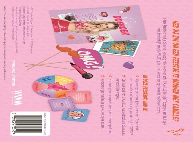 Met deze Feestbox van CAMILLE ga jij een superleuke avond tegemoet! In deze box vind je een leuk spel met draaischijf en quizvragen over CAMILLE, dilemma’s en opdrachten om samen te spelen. Neurie jouw favoriete liedje van CAMILLE of laat iemand lippenstift bij je opdoen. Neem de fotoprops van een microfoon, een diamant of een kroontje erbij en toon je beste poses tijdens een heuse fotoshoot. Je vindt er ook 8 postkaartjes en een boekje met recepten, knutselideeën en tal van spelletjes in terug. Deze feestbox is het ideale cadeau voor alle fans van CAMILLE.