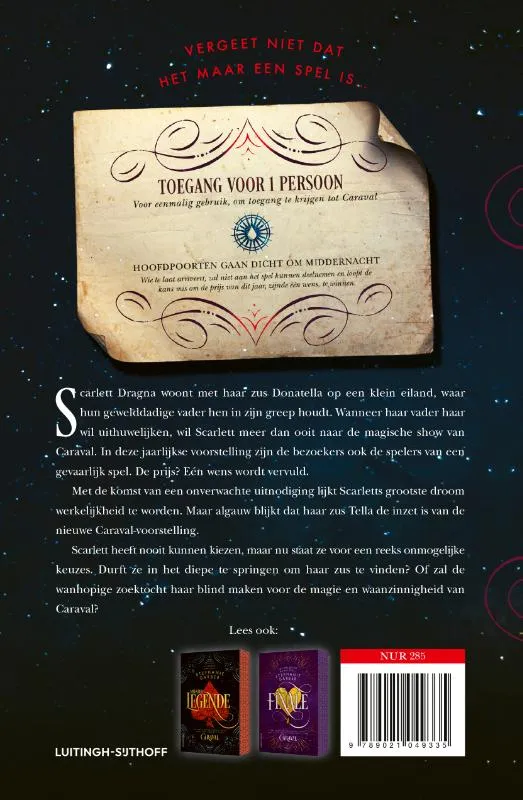 Caraval, het eerste deel van Stephanie Garbers razend populaire YA-serie over de zussen Scarlett en Donatella, is nu leverbaar als paperback met een prachtig, bedrukt boekblok. Tot deze serie behoren ook: Meester Legende (deel 2) en Finale (deel 3), en de Caraval-novelle Het spektakel.
