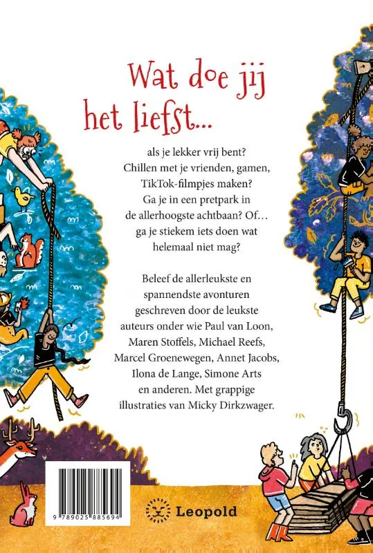 Wat doe jij het liefst als je lekker vrij bent? Chillen met je vrienden, gamen, TikTok-filmpjes maken, naar de kermis, spetteren in een tropisch zwemparadijs of ga je stiekem iets doen wat helemaal niet mag? Beleef de allerleukste en spannendste avonturen geschreven door de leukste auteurs onder wie Paul van Loon, Maren Stoffels, Michael Reefs, Marcel Groenewegen, Annet Jacobs, Ilona de Lange, Simone Arts en vele anderen. Met humoristische illustraties van Micky Dirkzwager.