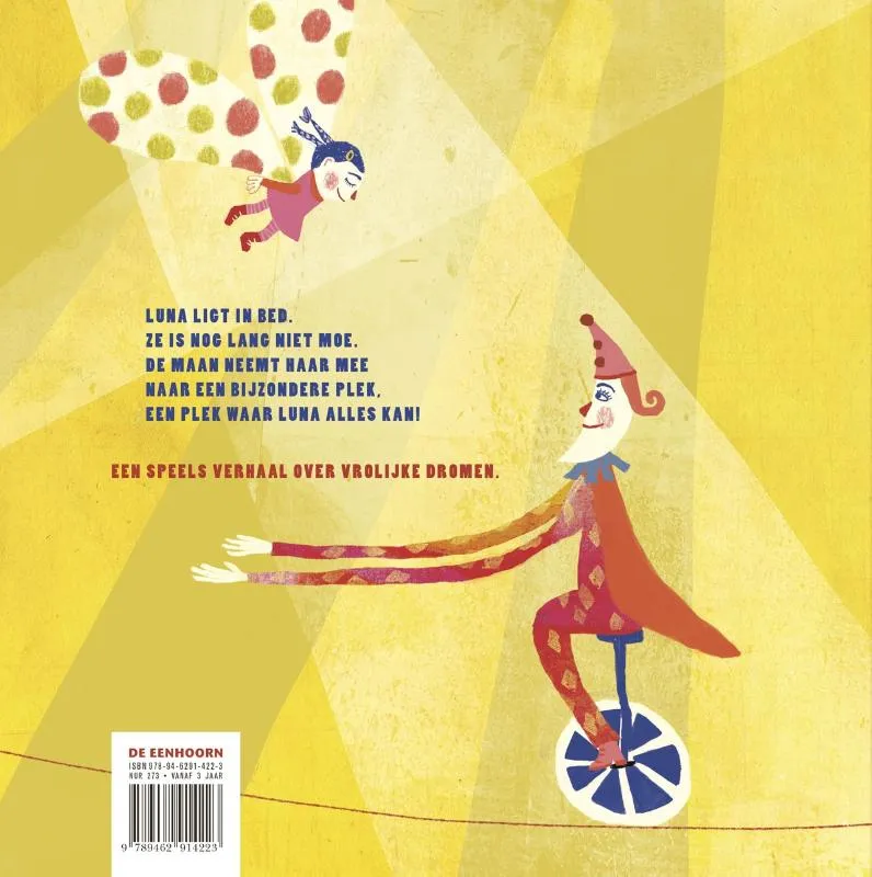 Luna ligt in bed. Ze is nog lang niet moe. De maan neemt haar mee naar een bijzondere plek: het circus. Daar is Luna de ster van de avond! Ze kan koorddansen, de leeuw temmen, jongleren … Luna is het sterkste meisje van het hele circus. Maar dan wordt Luna moe en vliegt ze terug naar huis. Slaap lekker, Luna!