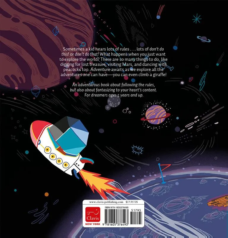 Sometimes a kid hears lots of rules . . . lots of don’t do this! or don’t do that! What happens when you just want to explore the world? There are so many things to do, like digging for lost treasure, visiting Mars, and dancing with peacocks too. Adventure awaits as we explore all the adventures one can have—you can even climb a giraffe!