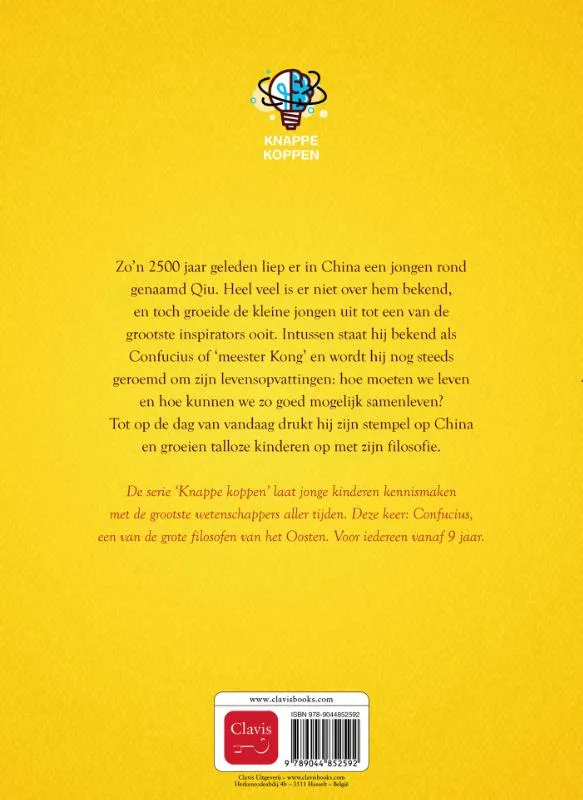 Zo’n 2500 jaar geleden liep er in China een jongen rond genaamd Qiu. Heel veel is er niet over hem bekend, en toch groeide de kleine jongen uit tot een van de grootste inspirators ooit. Intussen staat hij bekend als Confucius of ‘meester Kong’ en wordt hij nog steeds geroemd om zijn levensopvattingen: hoe moeten we leven en hoe kunnen we zo goed mogelijk samenleven? Tot op de dag van vandaag drukt hij zijn stempel op China en groeien talloze kinderen op met zijn filosofie.De serie ‘Knappe koppen’ laat jonge kinderen kennismaken met de grootste wetenschappers aller tijden. Deze keer: Confucius, een van de grote filosofen van het Oosten. Voor iedereen vanaf 9 jaar.