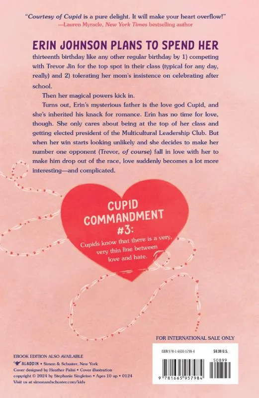In this funny and romantic story sprinkled with a dash of magic, a thirteen-year-old girl uses her newfound ability to make people fall in love to sabotage her rival.Erin Johnson’s thirteenth birthday unfolds like any other day, from her mom’s quirky and embarrassing choice of outfit to racing her nemesis, Trevor Jin, to the best seat in class—front row, center. But her gifts this year include something very out of the ordinary: magical powers. Erin discovers her mysterious father is actually the love god Cupid and she’s inherited his knack for romance. It’s not the most useful ability for an overachiever with lofty academic and extracurricular goals…or is it? Erin desperately wants to be elected president of the Multicultural Leadership Club, and as usual, Trevor is her fiercest competition. He’s never backed down from a challenge before, but if Erin makes him fall in love with her, maybe he’d drop out of the race and let her win. With her magical pedigree, wrapping Trevor around her finger is a snap, and having him around all the time is a small price to pay for victory. But without their cutthroat rivalry bringing out the worst in each other, Erin realizes Trevor may not be as bad as she thought, and suddenly her first foray into love gets a lot more complicated