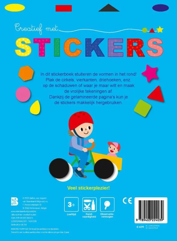 In dit stickerboek stuiteren de vormen in het rond!Maak jij dit prachtige kasteel af? Plak de cirkels, vierkanten, driehoeken, enz. op de schaduwen of waar je maar wilt en maak de vrolijke tekeningen af.Dankzij de gelamineerde pagina’s kun je de stickers makkelijk hergebruiken.Veel stickerplezier!