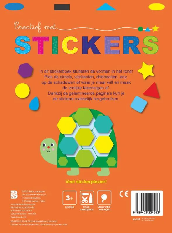 In dit stickerboek stuiteren de vormen in het rond!Laat rode appels aan de boom groeien en plak er ook enkele op de grond. Geef de vlinders mooie vleugels. Plak de cirkels, vierkanten, driehoeken, enz. op de schaduwen of waar je maar wilt en maak de vrolijke tekeningen af.Dankzij de gelamineerde pagina’s kun je de stickers makkelijk hergebruiken.Veel stickerplezier!