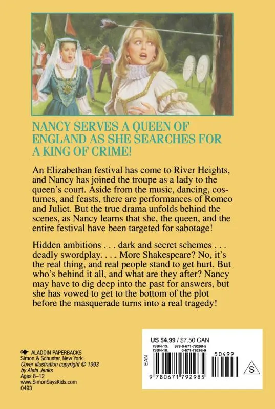 Nancy joins an Elizabethan troupe at the queen’s court. Amid performances and feasts, she discovers a plot targeting herself, the queen, and the entire festival.