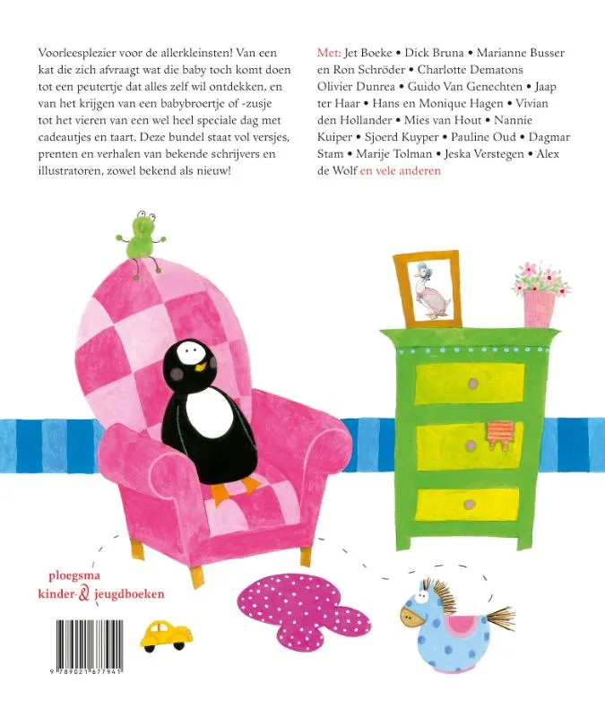 Voorleesplezier voor de allerkleinsten! Van een kat die zich afvraagt wat die baby toch komt doen tot een peutertje dat alles zelf wil ontdekken, en van het krijgen van een babybroertje of -zusje tot het vieren van een wel heel speciale dag met cadeautjes en taart. Deze bundel staat vol versjes, prenten en verhalen van bekende schrijvers en illustratoren, zowel bekend als nieuw!