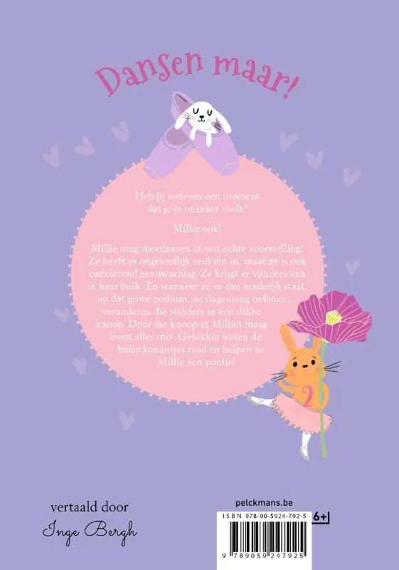 Millie mag meedansen in een echte voorstelling! Ze heeft er ongelooflijk veel zin in, maar ze is ook ontzettend zenuwachtig. Ze krijgt er vlinders van in haar buik. En wanneer ze er dan eindelijk staat, op dat grote podium, na wekenlang oefenen… veranderen die vlinders in een dikke knoop. Door die knoop in Millies maag loopt alles mis. Maar het is niet alleen de plankenkoorts die Millie parten speelt… Amber, een meisje uit de balletles, is niet zo gesteld op Millie en haalt een gemene streek met haar uit. Gelukkig weten de balletkonijntjes raad en helpen ze Millie een pootje! Vertaald door Inge Bergh