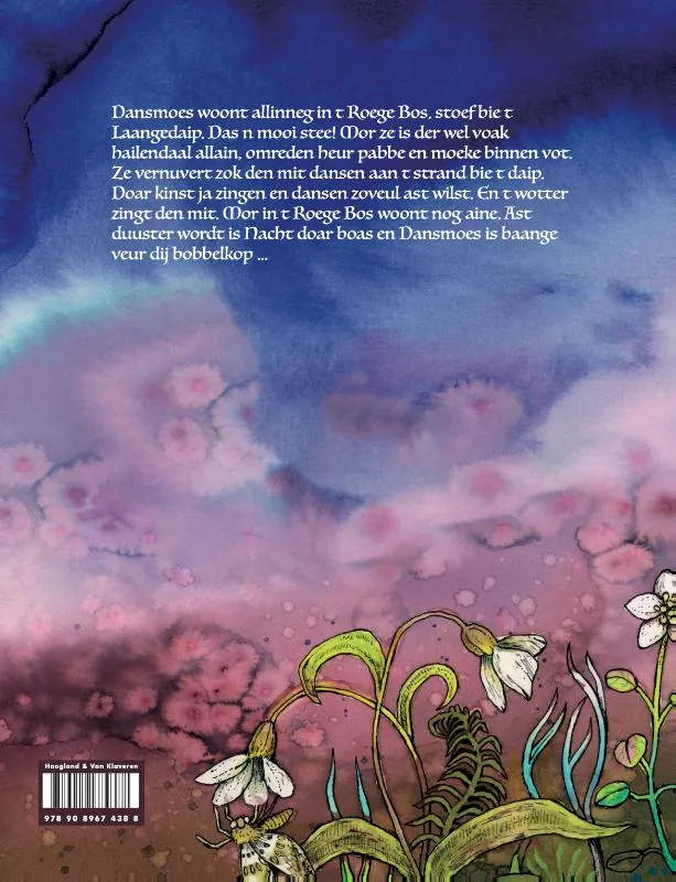 Dansmoes woont allinneg in t Roege Bos, stoef bie t Laangedaip. Das n mooi stee! Mor ze is der wel voak hailendaal allain, omreden heur pabbe en moeke binnen vot. Ze vernuvert zok den mit dansen aan t strand bie t daip. Doar kinst ja zingen en dansen zoveul ast wilst. En t wotter zingt den mit. Mor in t Roege Bos woont nog aine. Ast duuster wordt is Nacht doar boas en Dansmoes is baange veur dij bobbelkop …