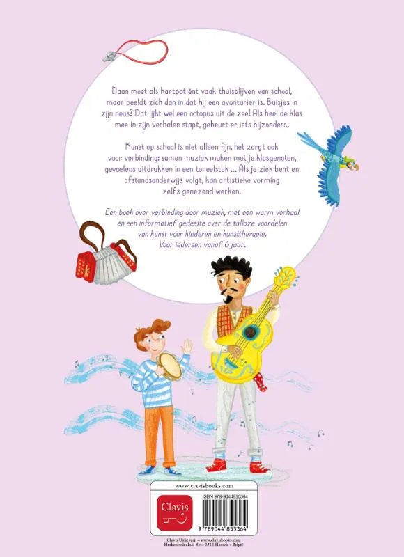 Daan moet als hartpatiënt vaak thuisblijven van school, maar beeldt zich dan in dat hij een avonturier is. Buisjes in zijn neus? Dat lijkt wel een octopus uit de zee! Als heel de klas mee in zijn verhalen stapt, gebeurt er iets bijzonders. Kunst op school is niet alleen fijn, het zorgt ook voor verbinding: samen muziek maken met je klasgenoten, gevoelens uitdrukken in een toneelstuk … Als je ziek bent en afstandsonderwijs volgt, kan artistieke vorming zelfs genezend werken.Een boek over verbinding door muziek, met een warm verhaal én een informatief gedeelte over de talloze voordelen van kunst voor kinderen en kunsttherapie. Voor iedereen vanaf 6 jaar.