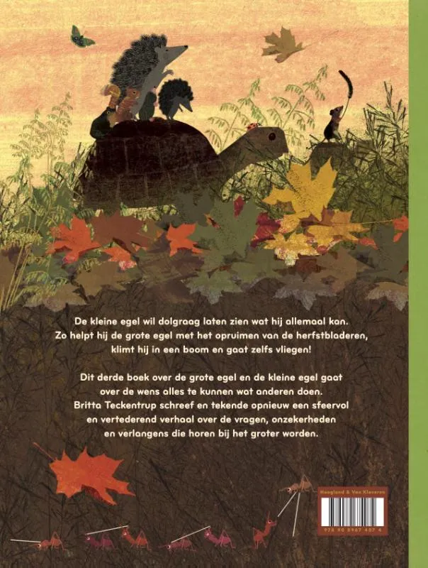 De kleine egel wil maar wat graag laten zien wat hij allemaal kan. Zo helpt hij de grote egel met het opruimen van de herfstbladeren, klimt hij in een boom in en gaat zelfs vliegen!