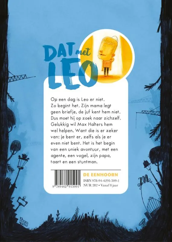 Op een dag is Leo er niet. Zo begint het. Zijn mama legde geen briefje, de hond van de buurman blaft niet naar hem. Dus moet hij op zoek naar zichzelf. Gelukkig wil Max hem wel helpen. Want die is er zeker van: je bent er, zelfs als je er even niet bent. Het is het begin van een uniek avontuur, met een agente, een vogel, zijn papa, taart en een stuntman.