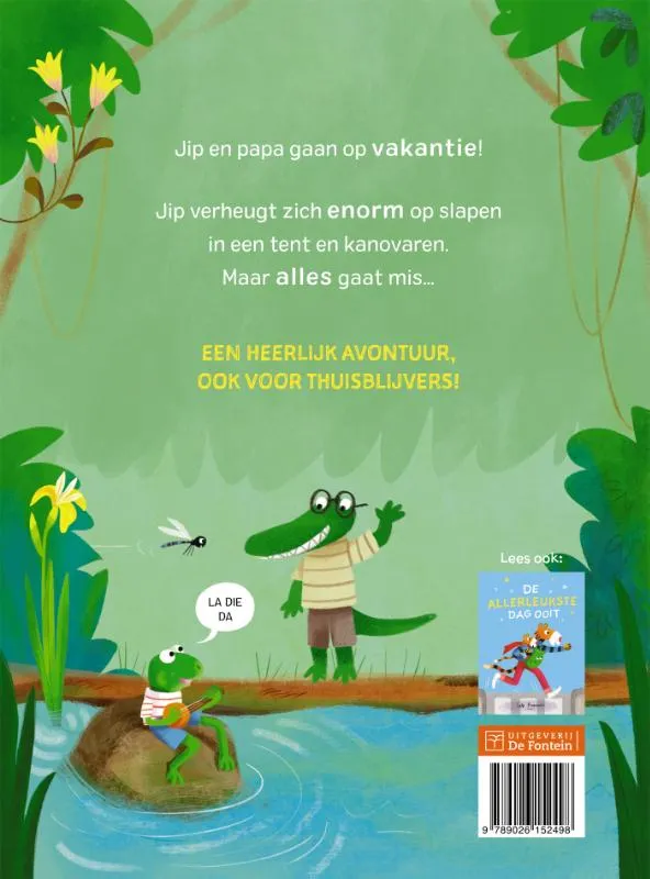Jip en papa gaan op vakantie. Jip heeft er zo’n zin in! Hij verheugt zich op slapen in een tent en kanovaren. Maar er gaat veel mis: pap weet niet hoe hij de tent moet opzetten, eten maken op een campinggasje blijkt lastig en ook het kanovaren is niet zo eenvoudig als gedacht…