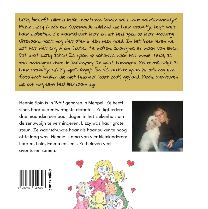 Lizzy beleeft allerlei leuke avonturen samen met haar mensenvriendjes. Maar Lizzy is ook een supergoede hulphond die haar vrouwtje helpt met haar diabetes. Ze waarschuwt haar en let heel goed op haar vrouwtje. Uiteraard gaat nog niet alles in één keer goed. In het boek leren we dat het niet erg is om fouten te maken, zolang we er maar van leren. Dat doet Lizzy zeker! Ze gaan op vakantie naar het mooie Texel, ze rolt ondeugend door de koeienpoep, ze gaat hardlopen. Maar ook helpt ze haar vrouwtje als zij hypo’s krijgt. En als laatste gaan ze ook nog een fotoshoot maken die niet helemaal loopt zoals gepland. Mooie avonturen die ook nog eens heel leerzaam zijn.
