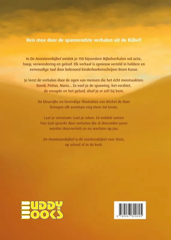 Stap in de wereld van De Avonturenbijbel en beleef de spannendste verhalen uit de Bijbel zoals nooit tevoren!Bekroond kinderboekenschrijver Bram Kasse brengt deze tijdloze verhalen tot leven in taal die jong en oud raakt. Perfect voor kinderen die de Bijbel willen ontdekken – en voor ouders die samen met hen op avontuur willen gaan. De prachtige illustraties van Michel de Boer, meester in kinderboekenillustraties, maken elk verhaal nog levendiger. Samen hebben zij een kinderbijbel gecreëerd die je niet alleen wilt lezen, maar keer op keer wilt herbeleven.Laat je meevoeren door verhalen vol moed, geloof en verrassingen – De Avonturenbijbel is een boek dat inspireert, ontroert en fascineert!