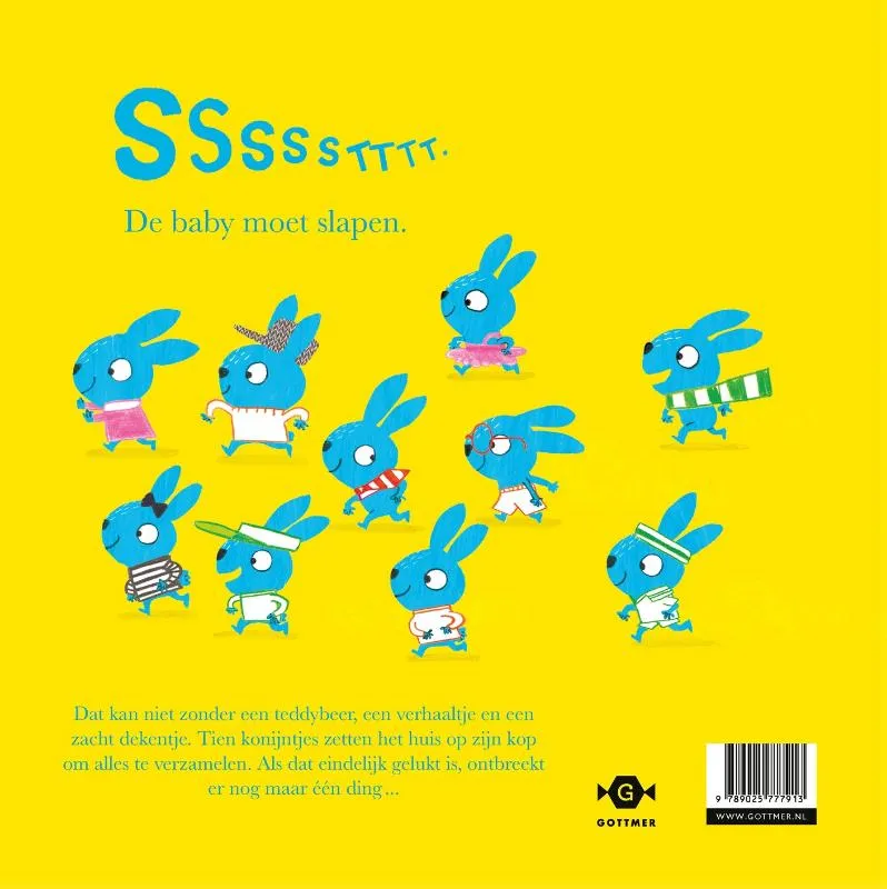 In ‘De baby moet slapen’ krijgen jonge lezers samen met een hele troep schattige konijntjes de taak om de baby naar bed te brengen. Maar de baby wil niet zomaar in slaap vallen. Eerst nog een teddybeer, een verhaaltje en een zacht dekentje. De konijntjes halen alles uit de kast en zetten het huis op zijn kop om dat allemaal te verzamelen. Als het dan eindelijk gelukt is en de baby ligt op bed, ontbreekt er nog maar één ding: een welterustenkus! Maar… wat krijgen we nu? De tien konijntjes kunnen ook niet slapen zonder beer, boek en dekentje. Daar gaan we weer!