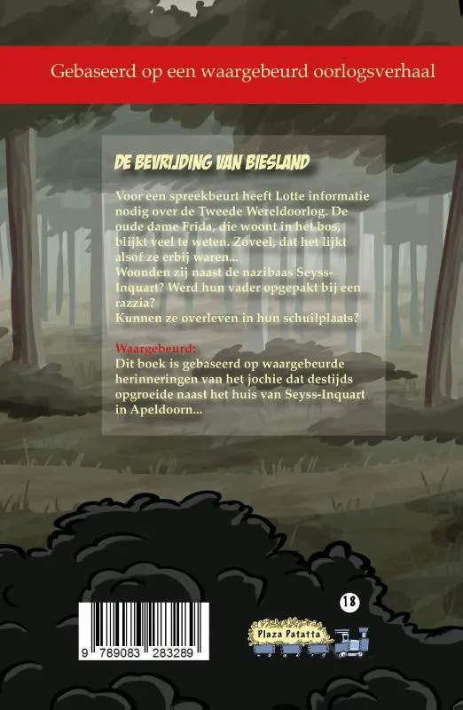 Voor een spreekbeurt heeft Lotte informatie nodig over de Tweede Wereldoorlog. De oude dame Frida, die woont in het bos, blijkt veel te weten. Zoveel, dat het lijkt alsof ze erbij waren… Woonden zij naast de nazibaas Seyss-Inquart? Werd hun vader opgepakt bij een razzia?Kunnen ze overleven in hun schuilplaats?Waargebeurd:Dit boek is gebaseerd op waargebeurde herinneringen van het jochie dat destijds opgroeide naast het werkhuis van Seyss-Inquart in Apeldoorn…