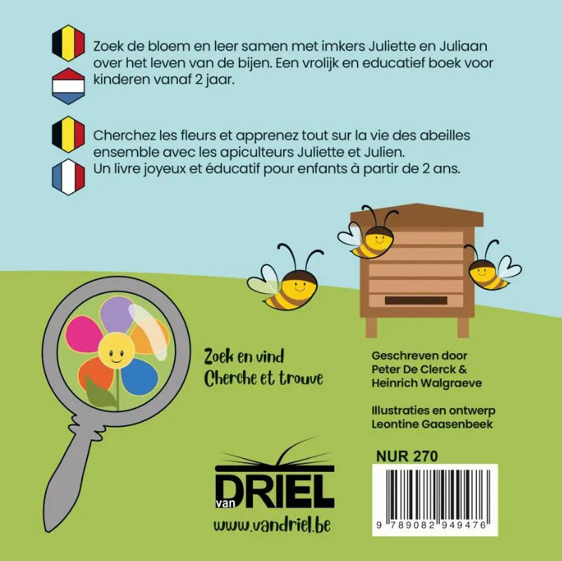 Zoek de bloem en leer samen met imkers Juliette en Juliaan over het leven van de bijen. Een vrolijk en educatief boek voor kinderen vanaf 2 jaar.