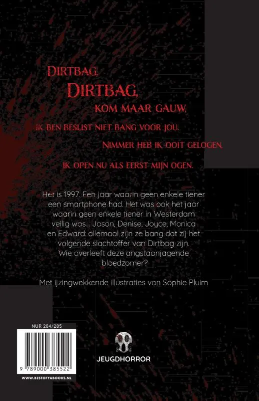 Na Clownsnacht en Het huis zonder einde schreef Daniëlle Bakhuis opnieuw een verhaal om van te gruwelen. Vijfentwintig jaar geleden werd Westerdam geteisterd door een reeks bloederige moorden. Er wordt gefluisterd dat Dirtbag het op tieners heeft voorzien. Er wordt ook gefluisterd dat niemand veilig is… Jason, Laura, Alice, Denise, Monica, Edward en Joyce: allemaal zijn ze bang dat zij de volgende zullen zijn. De bloedzomer van 1997 is een ijzingwekkende slasher zonder smartphones, Netflix en internet, maar mét creepy urban legends als Elisa Day en de moordenaar op de achterbank.