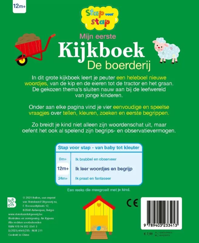 In dit grote kijkboek leert je peuter meer dan 120 nieuwe woordjes, van de kip en de eieren tot de tractor en het graan. De gekozen thema’s sluiten nauw aan bij de leefwereld van jonge kinderen.